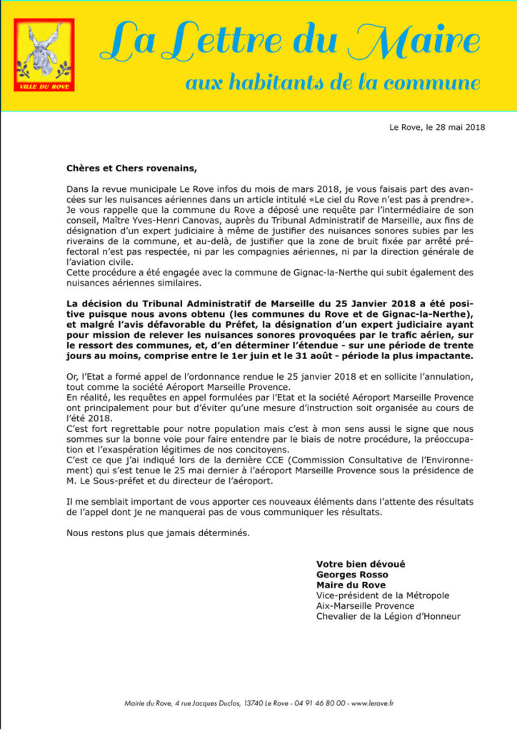 Je vous rappelle que la commune du Rove a déposé une requête par l’intermédiaire de son conseil, Maître Yves-Henri Canovas, auprès du Tribunal Administratif de Marseille, aux fins de désignation d’un expert judiciaire à même de justifier des nuisances sonores subies par les riverains de la commune, et au-delà, de justifier que la zone de bruit fixée par arrêté préfectoral n’est pas respectée, ni par les compagnies aériennes, ni par la direction générale de l’aviation civile.
