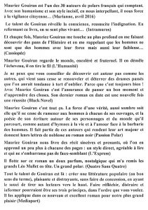 Maurice Gouiran figure parmi les 30 auteurs de polars français qui comptent. Humanisme et style incisif, en nous interpellant, il nous force à la vigilance citoyenne… » Marianne