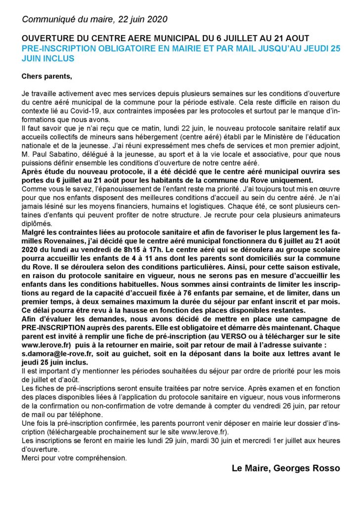 Malgré les contraintes liées au protocole sanitaire et afin de favoriser le plus largement les familles Rovenaines, j’ai décidé que le centre aéré municipal fonctionnera du 6 juillet au 21 août 2020 du lundi au vendredi de 8h15 à 17h. Le centre aéré qui se déroulera au groupe scolaire pourra accueillir les enfants de 4 à 11 ans dont les parents sont domiciliés sur la commune du Rove. Il se déroulera selon des conditions particulières. Ainsi, pour cette saison estivale, en raison du protocole sanitaire en vigueur, nous ne serons pas en mesure d’accueillir les enfants dans les conditions habituelles. Nous sommes ainsi contraints de limiter les inscriptions au regard de la capacité d’accueil fixée à 76 enfants par semaine, et de limiter, dans un premier temps, à deux semaines maximum la durée du séjour par enfant inscrit et par mois. Ce délai pourra être revu à la hausse en fonction des places disponibles restantes.