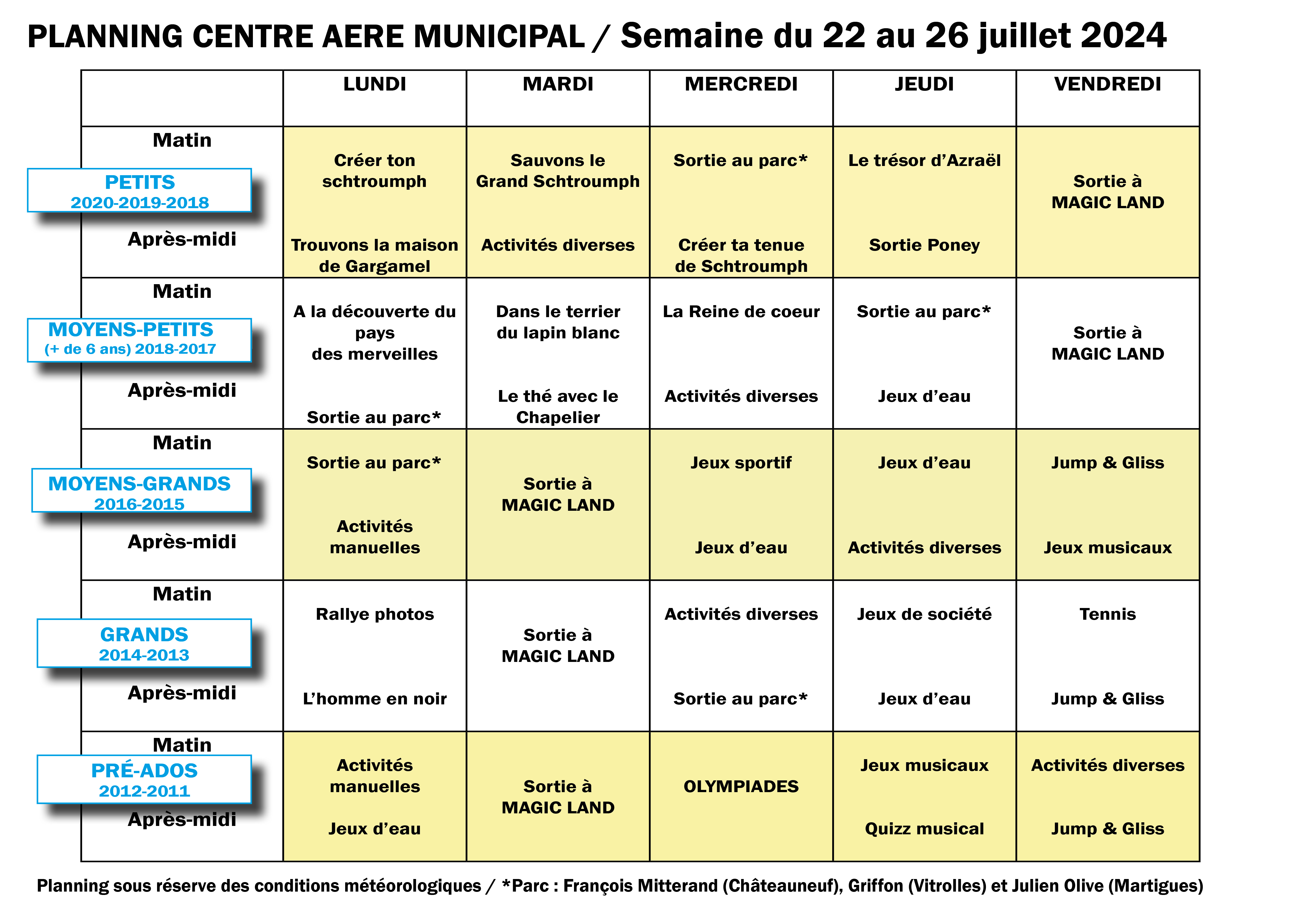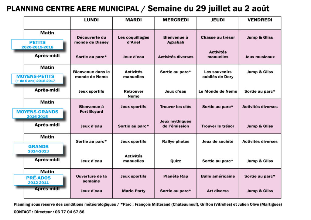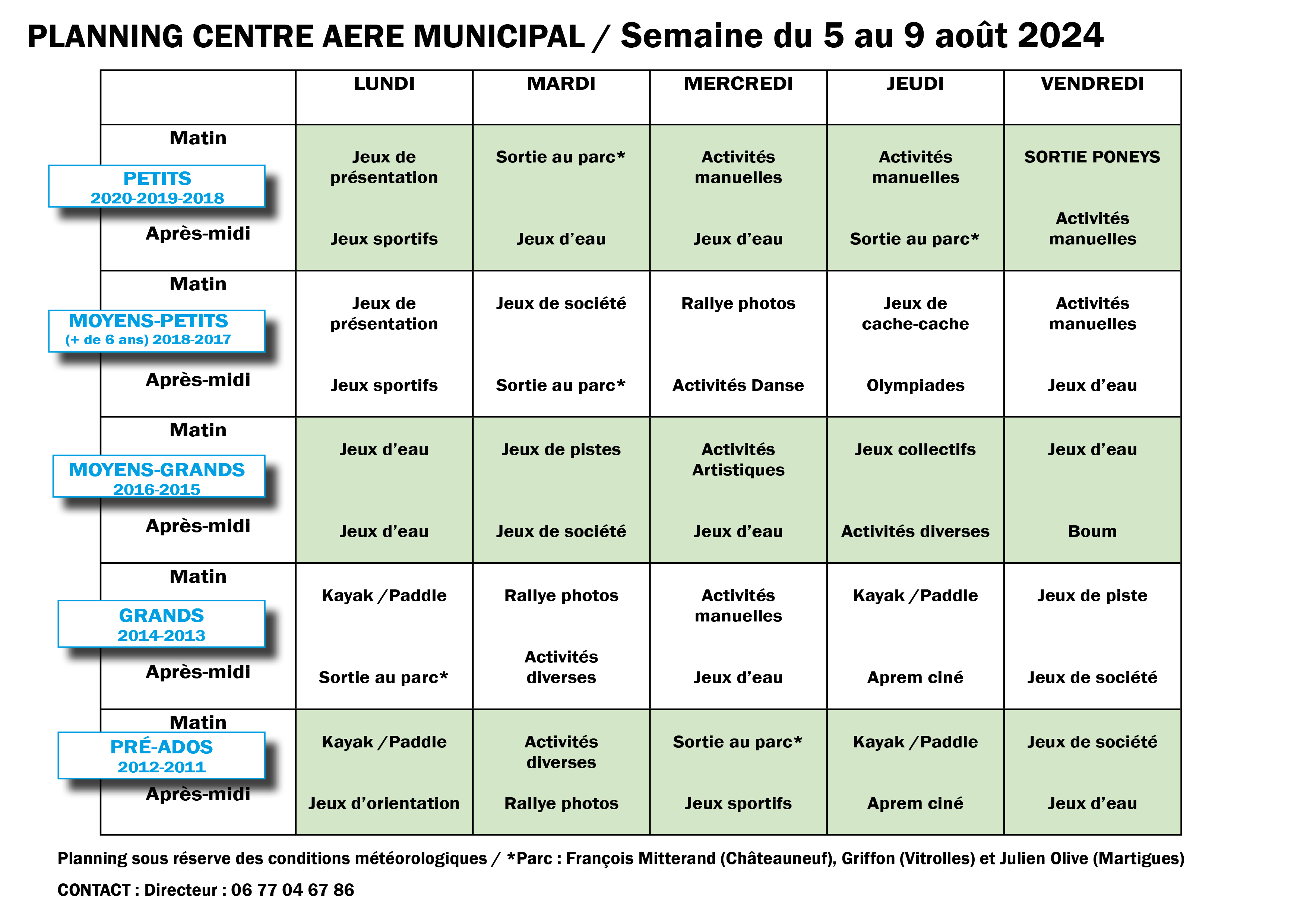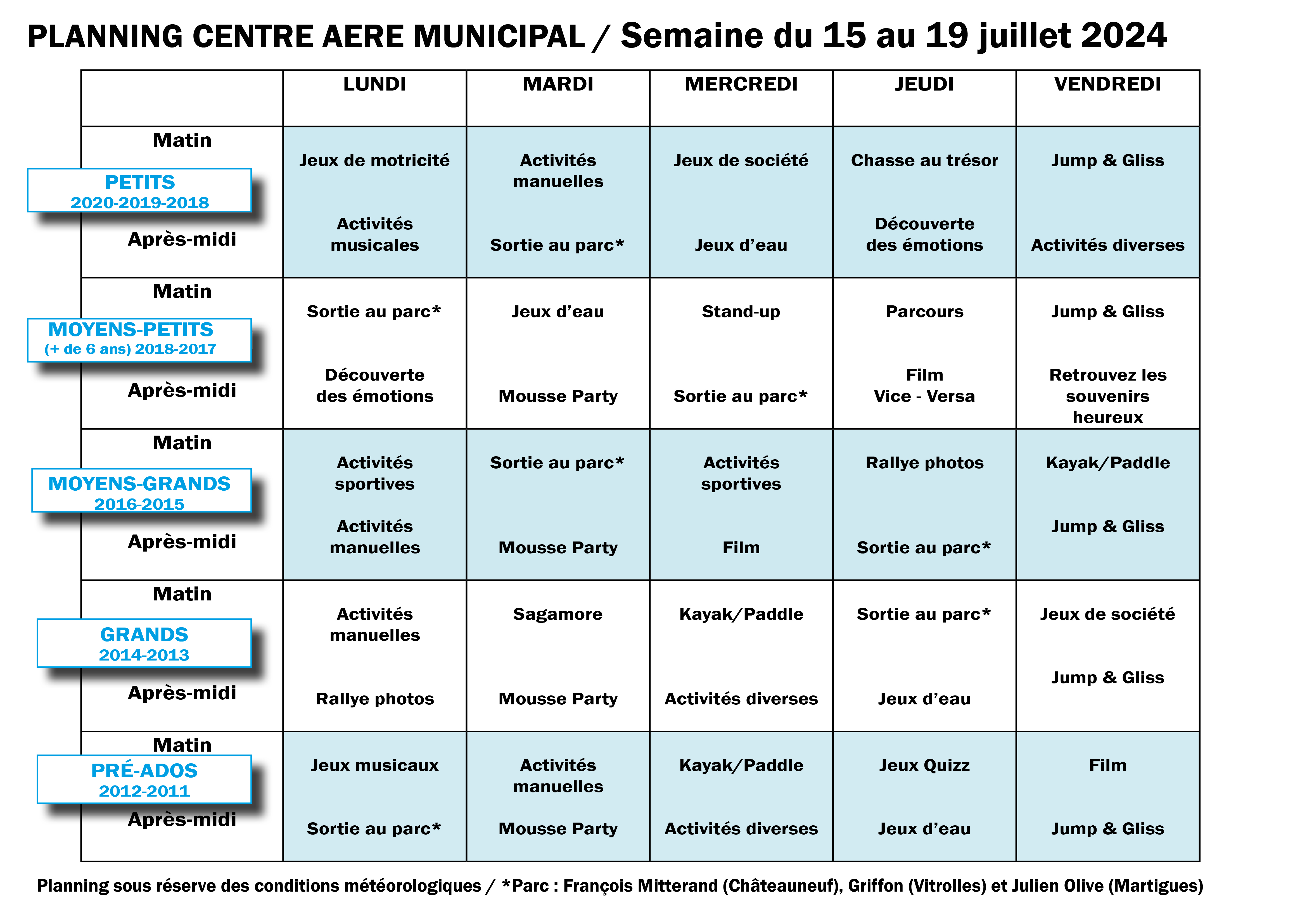 > Le planning des activités sera publié chaque vendredi pour la semaine suivante (ci-dessous et par affichage au centre). Les plannings peuvent être modifiés en raison des conditions météorologiques.