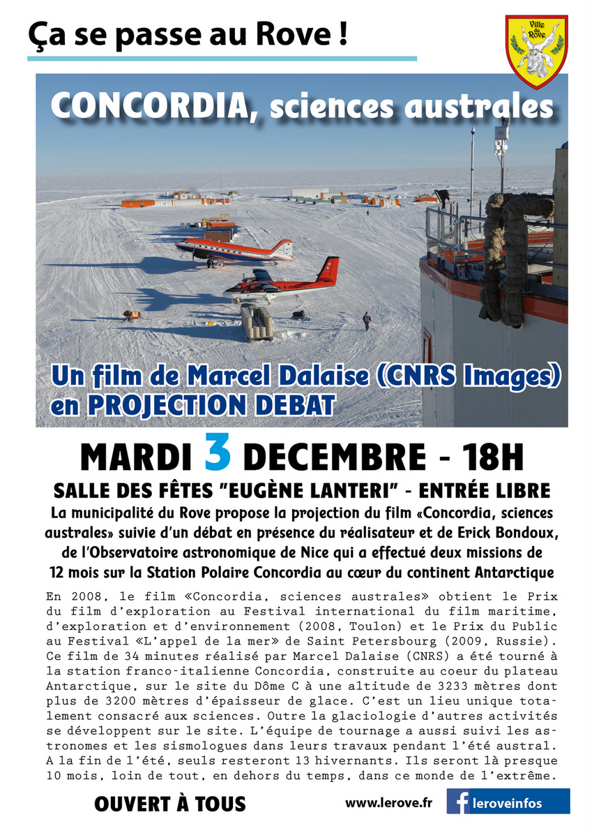 La municipalité du Rove propose la projection du film «Concordia, sciences australes» suivie d’un débat en présence du réalisateur, le Rovenain Marcel Dalaise (CNRS Images) et de Erick Bondoux, de l’Observatoire astronomique de Nice qui a effectué deux missions de 12 mois sur la Station Polaire Concordia au cœur du continent Antarctique.
