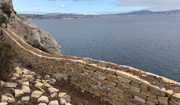 > Travaux sur les versants rocheux de Méjan, Erevine, Baume de Lume, Aragnols (Le Rove) et Pierres Tombées (Le Rove) : 270 m² d’écrans pare-blocs, 160 m de murs pare-blocs avec parement de style «pierres sèches», 8 700 m² de filets et grillages, 200 m3 de purges, aménagements et insertions paysagères.