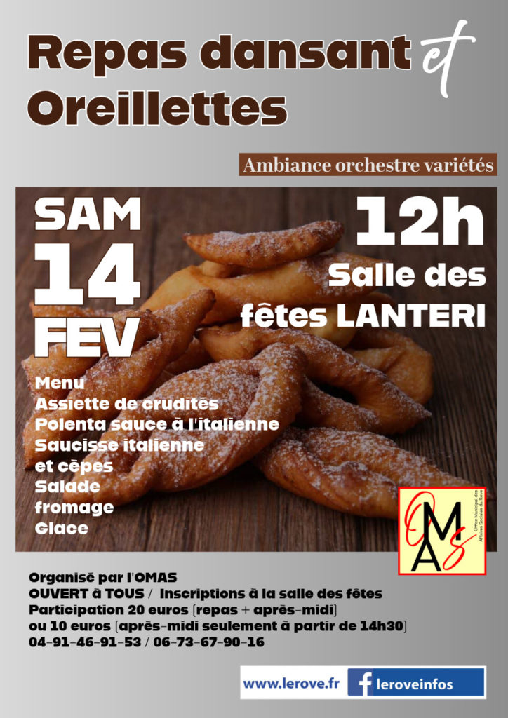 Réservez dès maintenant votre place pour participer au repas dansant "OREILLETTES ET VIN BLANC" du samedi 14 février à partir de midi à la salle des fêtes du Rove.