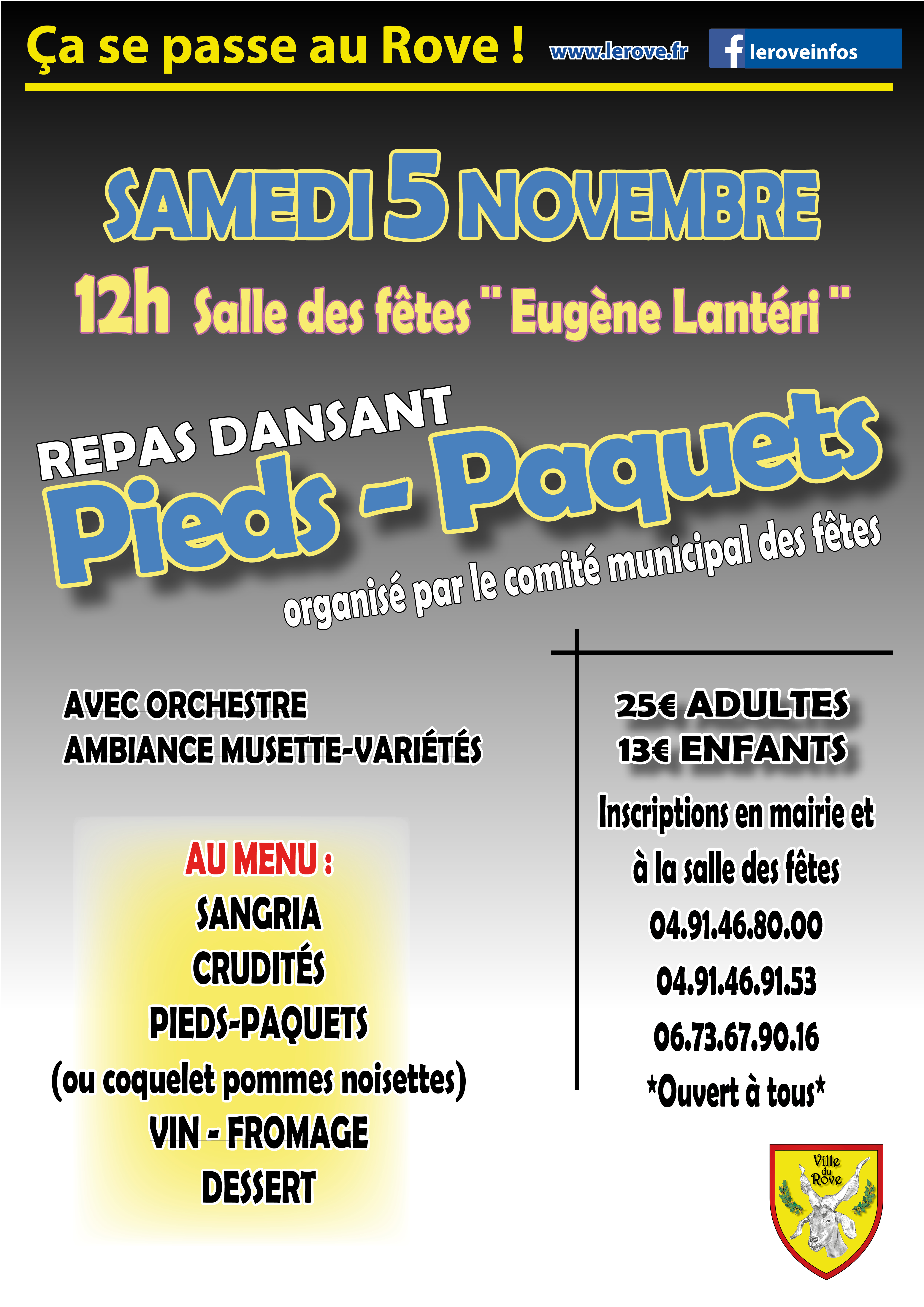 Le Comité des fêtes du Rove organise le samedi 5 novembre à midi un repas "Pieds paquets" suivi d'un après-midi dansant animé par un orchestre de variétés musette.