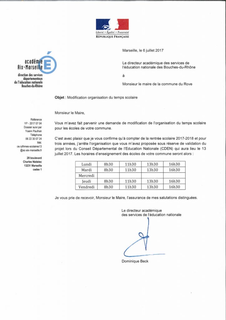 Suite à l'avis favorable unanime émis lors du conseil d'école extraordinaire du 29 juin dernier, le directeur académique des services de l'éducation nationale a confirmé qu'à compter de la rentrée scolaire 2017/2018 et pour trois années, l'organisation proposée, à savoir le retour à la semaine de quatre jours.
