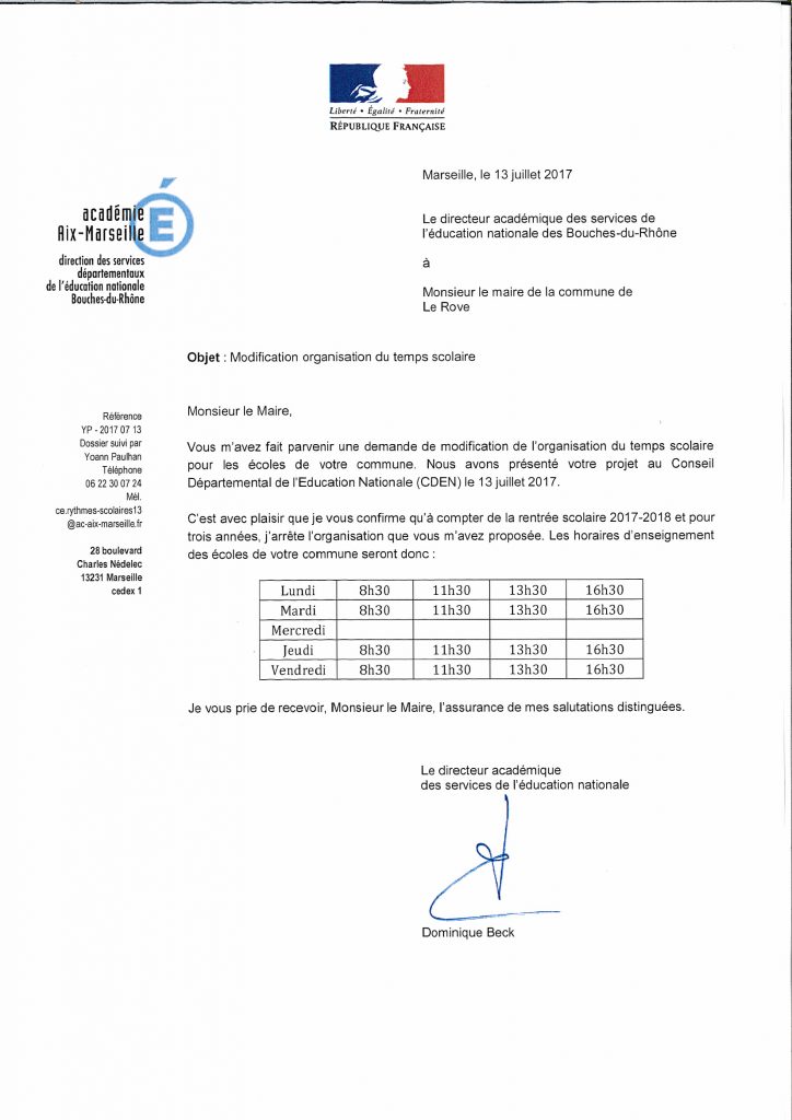 Le Conseil Départemental de l’Éducation Nationale (CDEN) a validé l'organisation du temps scolaire pour le groupe scolaire François Bessou (maternelle et élémentaire) à 4 jours pour la rentrée scolaire 2017-2018.