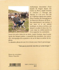 Il y a 20 ans, le berger du Rove André Gouiran publiait Le Rove, ses chèvres et ses collines aux éditions Taccussel. Il y racontait ses souvenirs, ceux des vieux bergers et son métier pastoral d’aujourd’hui. Vingt ans plus tard, son ouvrage (épuisé depuis 10 ans) est réédité. « Le texte n’a pas changé. Nous avons seulement ajouté six pages en fin d’ouvrage et quelques photos » précise André Gouiran.