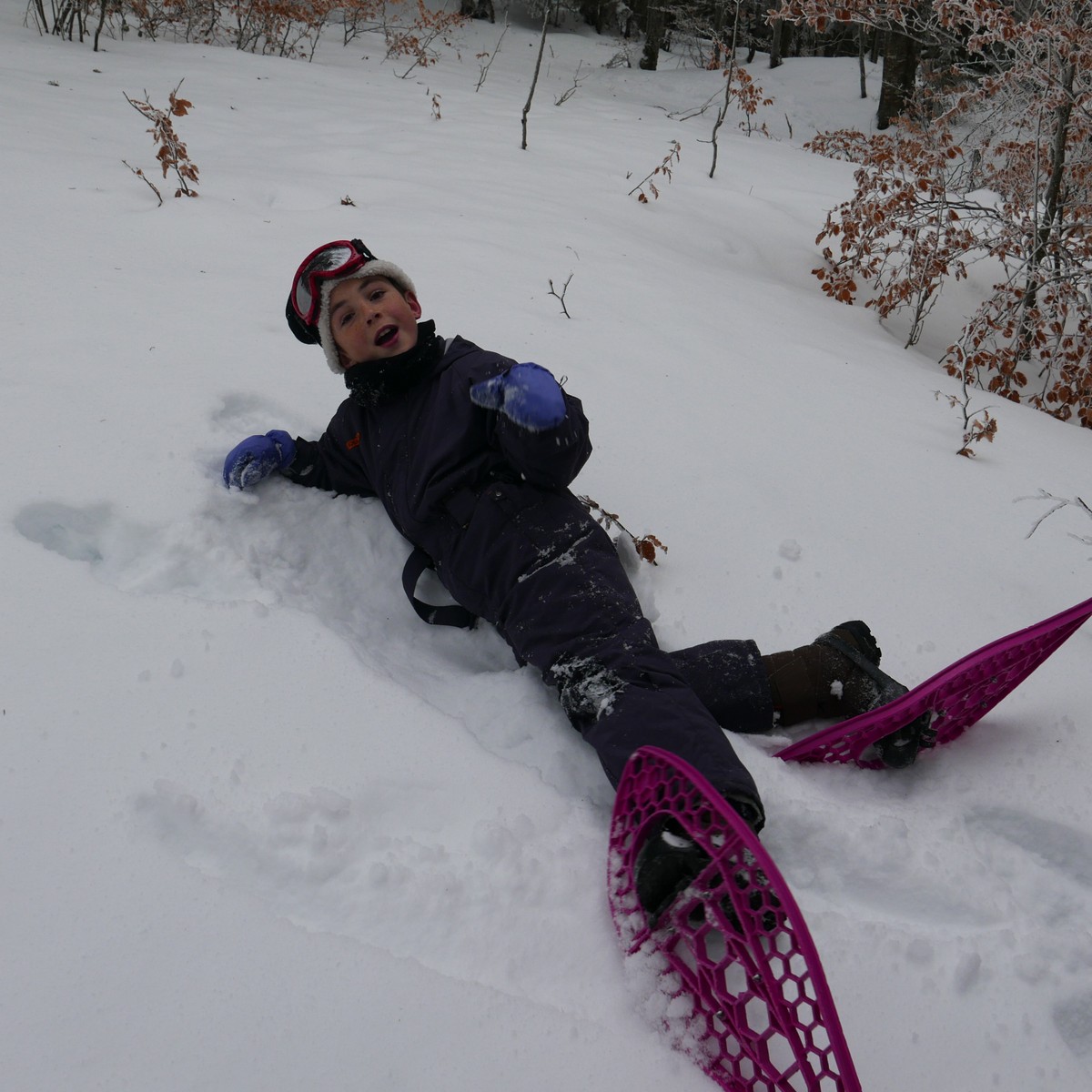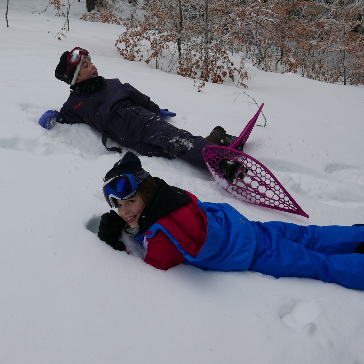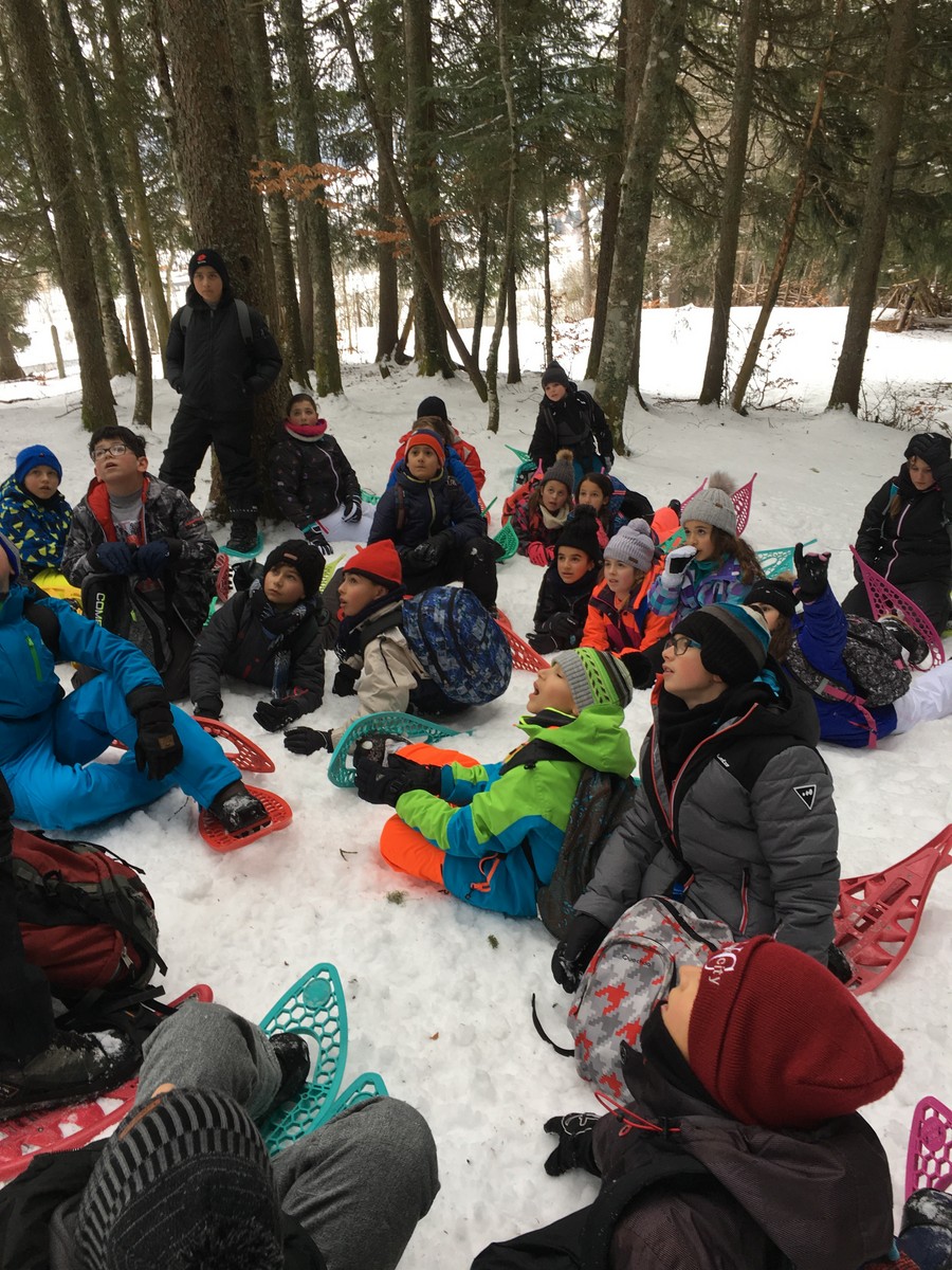 L’après-midi ce fut une belle balade en raquettes parsemée de glissades, de roulades et de sauts dans la neige à la recherche de traces d’animaux sauvages.