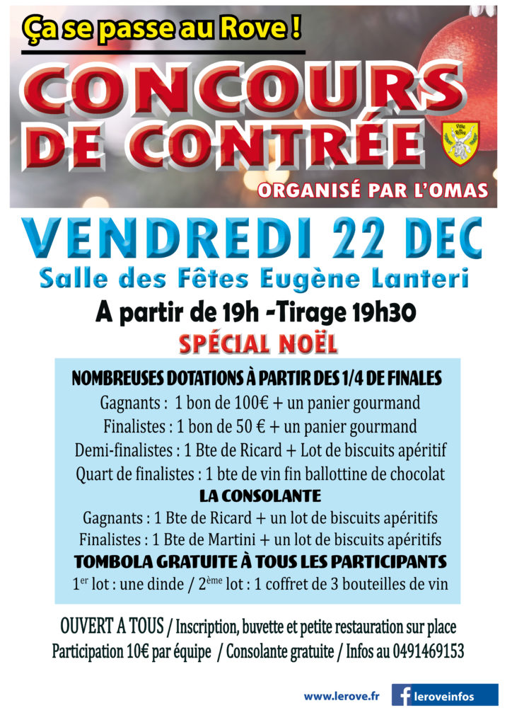 Le vendredi 22 décembre, l'Office municipal des affaires sociales du Rove organise un super concours de contrée "spécial Noël". Pour marquer cet évènement, l'Omas met en jeu des lots dès les 1/4 de finale avec aussi une tombola gratuite à tous les participants. Ambiance conviviale garantie. Ouvert à tous.