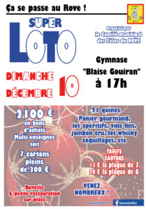 C'est Noël avant l'heure ce dimanche 10 décembre avec le super LOTO annuel organisé par le comité des fêtes à 17h au gymnase municipal Blaise Gouiran. Venez nombreuses et nombreux tenter votre chance pour gagner des supers lots.