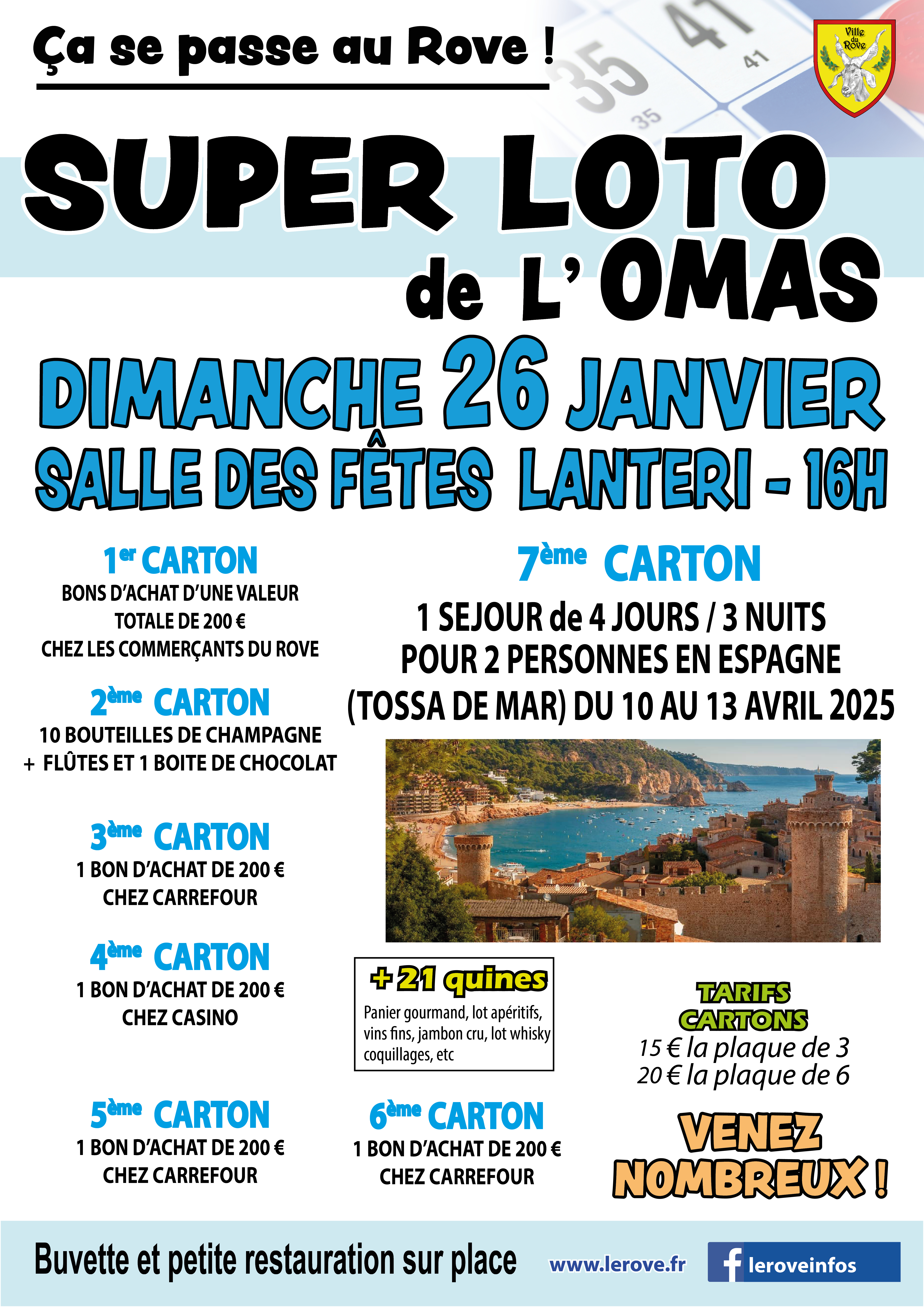Le dernier SUPER LOTO de la saison se déroulera dimanche 26 janvier à la salle des fêtes à 16 heures. Ouvert à tous et organisé par l'office municipale des affaires sociales, il propose de supers lots à gagner parmi lesquels un séjour en Espagne.