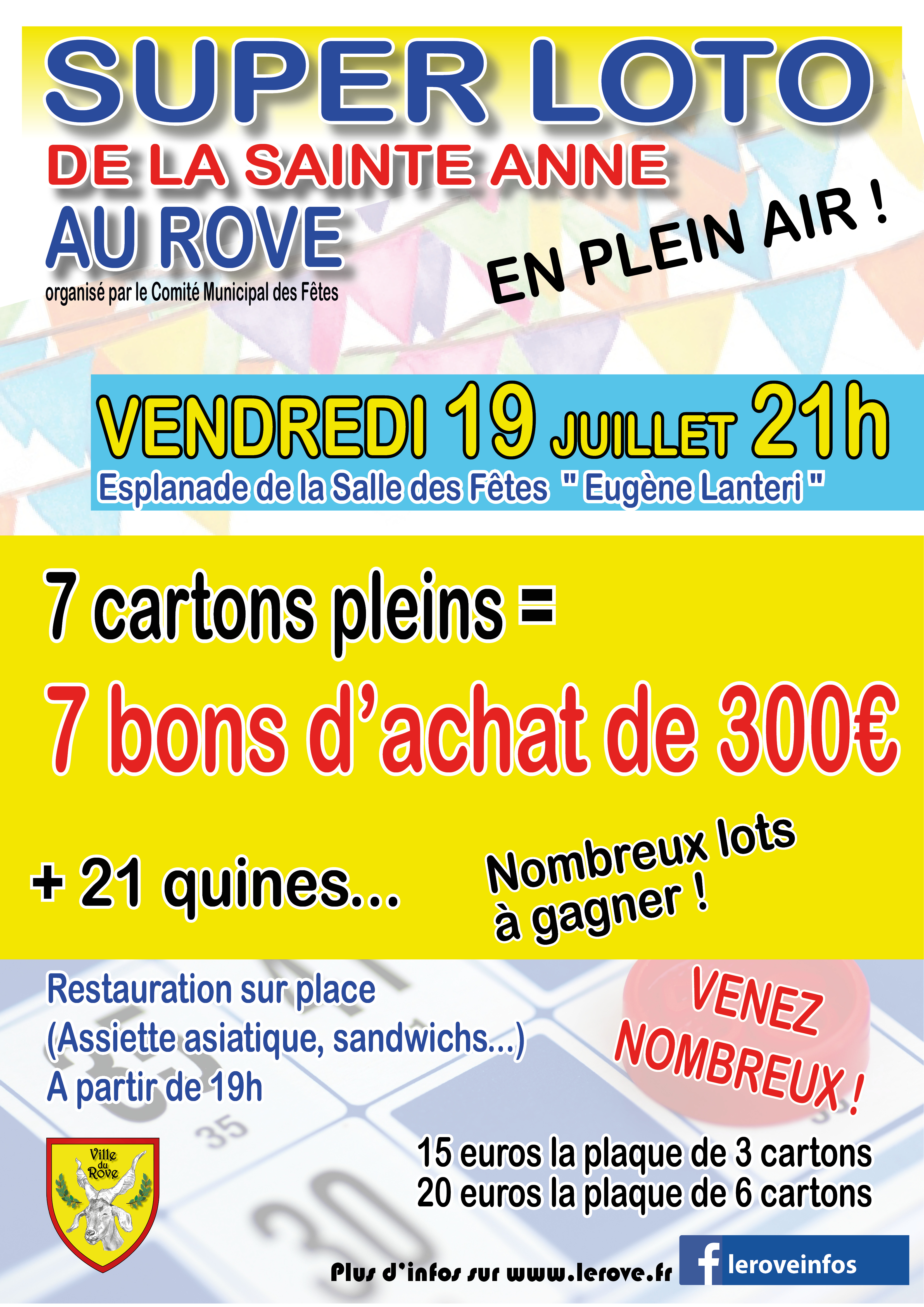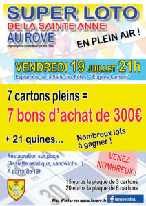SUPER LOTO EN PLEIN AIR et ESPACE FESTI’LOISIRS ce vendredi 19 JUILLET au ROVE !!! OUVERT A TOUS / SANS RÉSERVATION