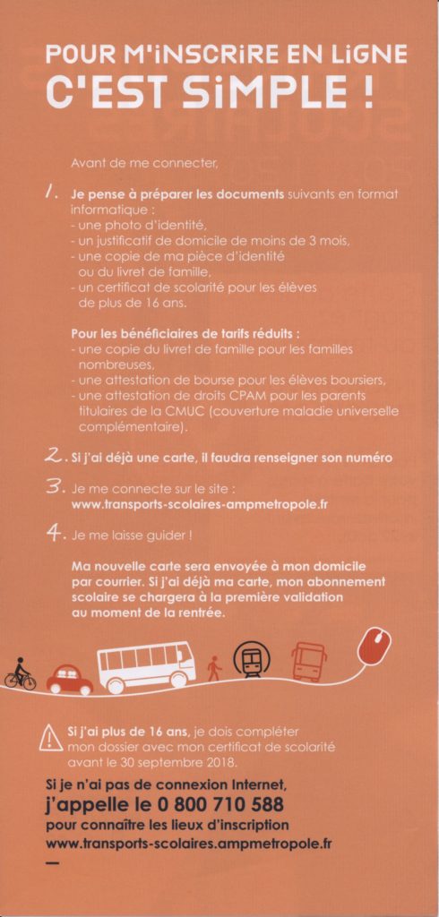 La rentrée scolaire 2018/2019 se prépare maintenant et chez vous ! Plus besoin de se déplacer, les inscriptions aux transports scolaires se font sur internet. Connectez-vous dès le 9 juillet au www.transportsscolaires.ampmetropole.fr et laissez vous guider.