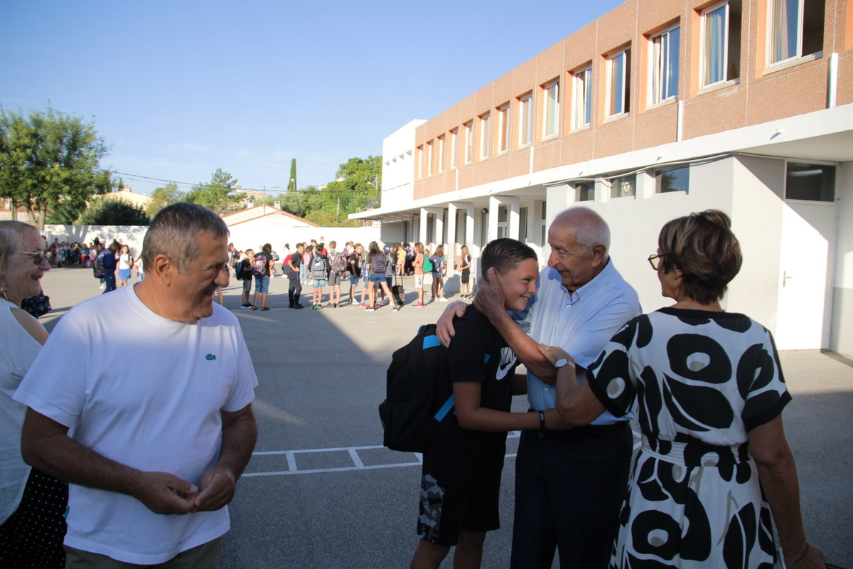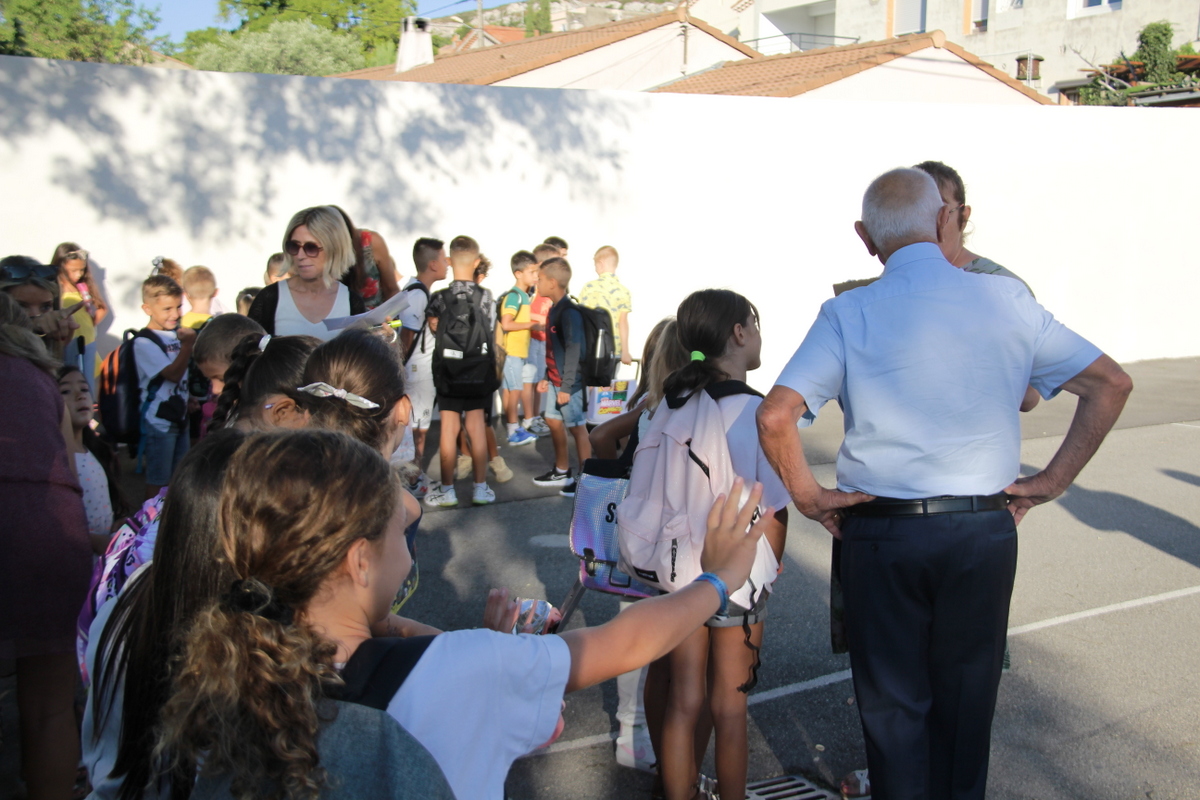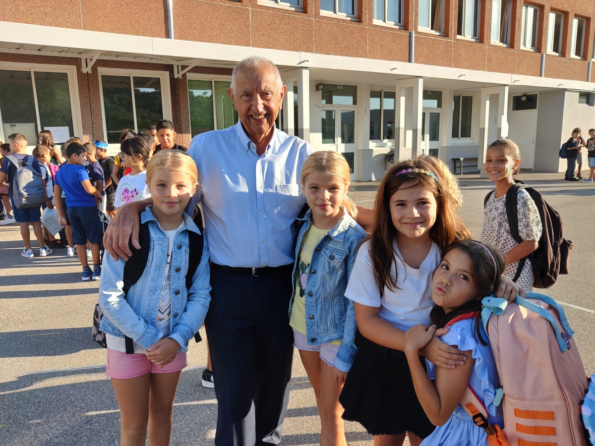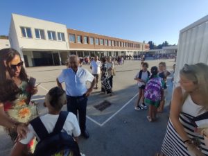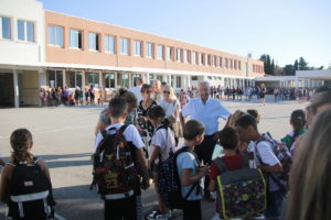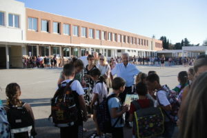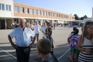 Au Rove, la rentrée s’est déroulée avec succès ce jeudi matin au groupe scolaire communal François Bessou qui a accueilli 517 élèves (180 élèves à l’école maternelle et 337 élèves à l’école élémentaire – voir effectifs ci-dessous). Le maire de la commune, Georges ROSSO, qui ne rate aucune rentrée, et qui était accompagné de ses adjointes et adjoints, M. Paul SABATINO (premier adjoint), Mme Chantal GIRAUD (déléguée aux écoles), Mme Jeanne CORTES (déléguée à la petite enfance et à l’action sociale), Mme Viviane ROSSO (déléguée au personnel) et de M. David GUEVARA (conseiller municipal délégué à l’école, et également enseignant à l’école élémentaire) ainsi que de l’inspecteur d’académie de la circonscription M. Olivier HOFFALT, s’est montré satisfait.