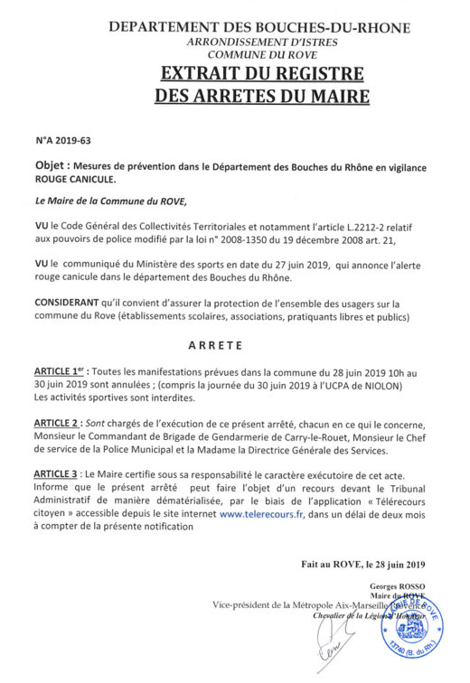 Vu le communiqué du Ministère des Sports en date du 27 juin 2019 qui annonce l'alerte rouge canicule dans le département des Bouches-du-Rhône, et considérant qu'il convient d'assurer la protection de l'ensemble des usagers sur la commune du Rove (établissements scolaires, associations, pratiquants libres et publics), le maire de la commune a pris un arrêté municipal ce jour stipulant que "toutes les manifestations prévues dans la commune du 28 juin 2019 à 10h jusqu'au 30 juin 2019 sont annulées (y compris la journée du 30 juin prévue au centre UCPA de Niolon). Les activités sportives sont interdites."
