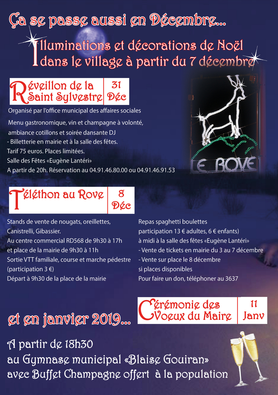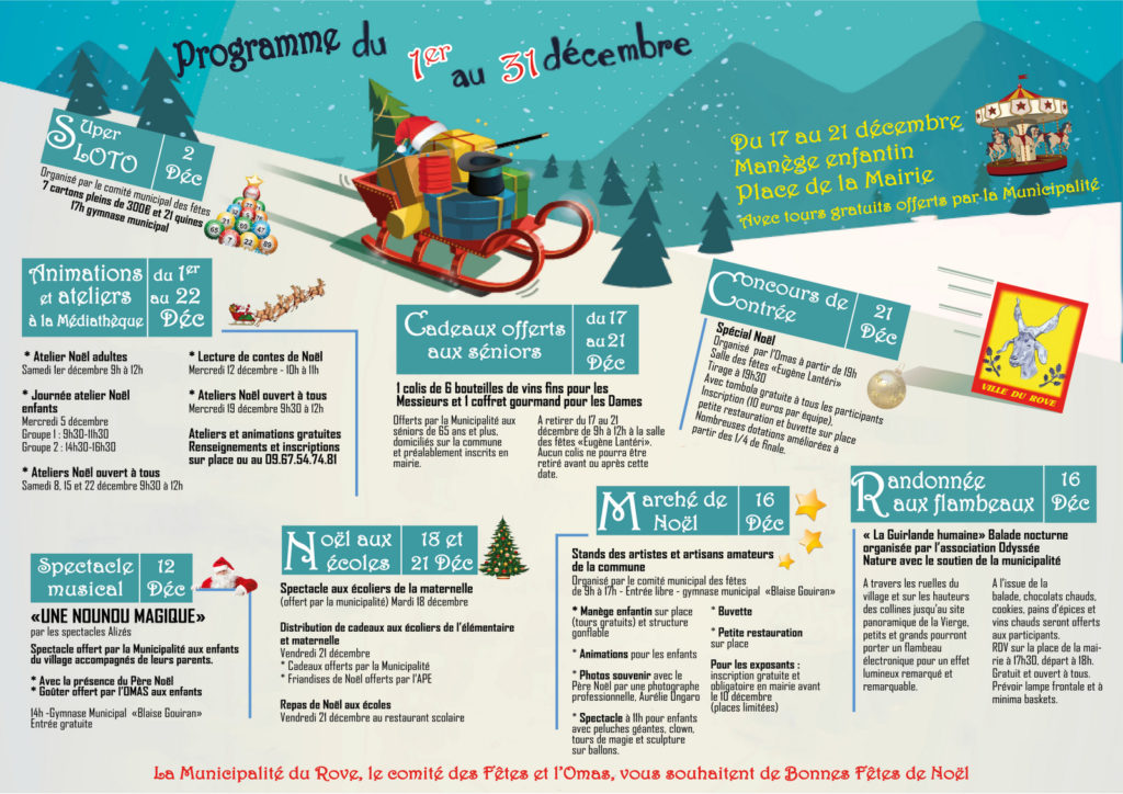 Dans le cadre des festivités de Noël, la municipalité du Rove propose de nombreuses animations et manifestations pour tous, à partir du 2 décembre. Avec le comité municipal des fêtes, l'Office municipal des affaires sociales, l'association Odyssée Nature.