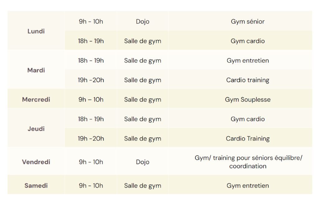Nous proposons des cours pour tout public. Renforcement et amélioration de la forme physique avec et sans matériel. Chorégraphie, travail au sol; abdos fessiers et des étirements en cours collectif.